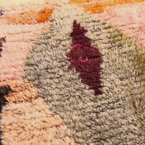 💭 What Are Boujad Rugs? Boujad rugs are made by Berber tribes but they are named after the town of Boujad. The surrounding region of this town lies in the western foothills of the Middle Atlas adjoining the Zaer tribal territory in the extreme western corner, and the town Beni Mellal at the northernmost edge of Western High Atlas. The knotted rugs have typically a low pile and are often made with mixed materials such as wool, cotton, textile scraps and industrial yarns. Their designs are often highly individual containing Berber motifs, motifs found in Rabat rugs, distorted checkerboard fields and gestural abstract patterns- all in lively colors.