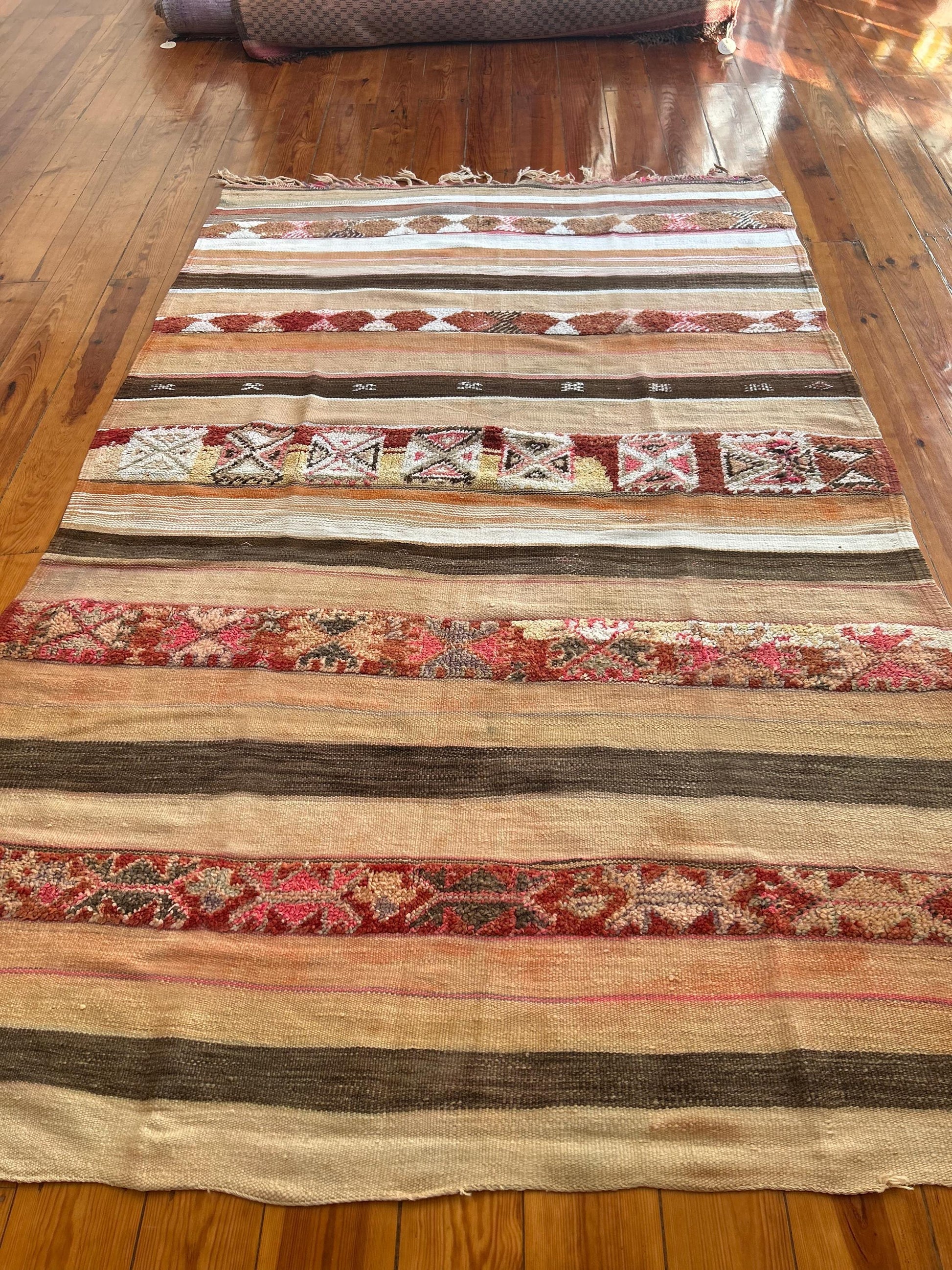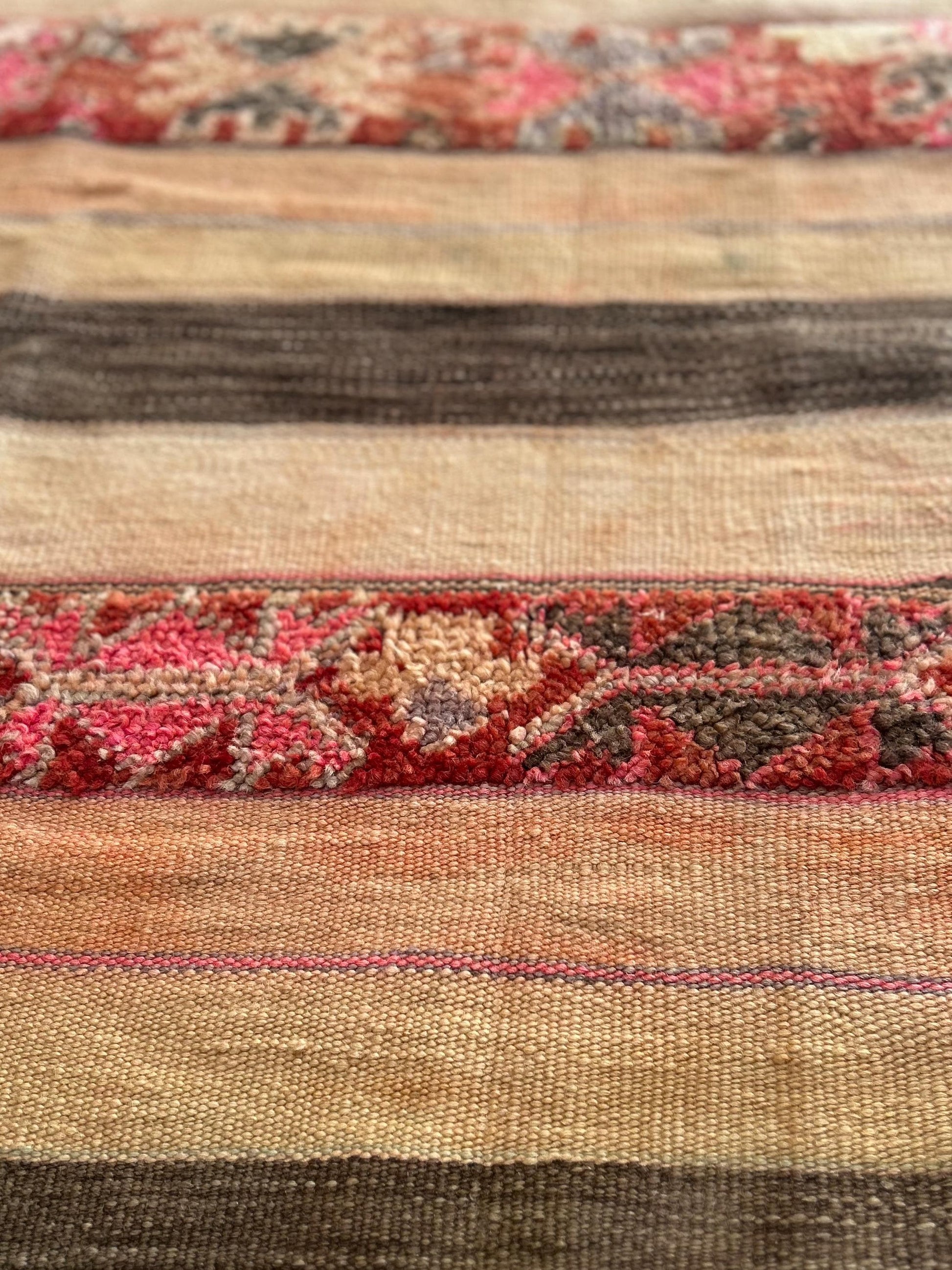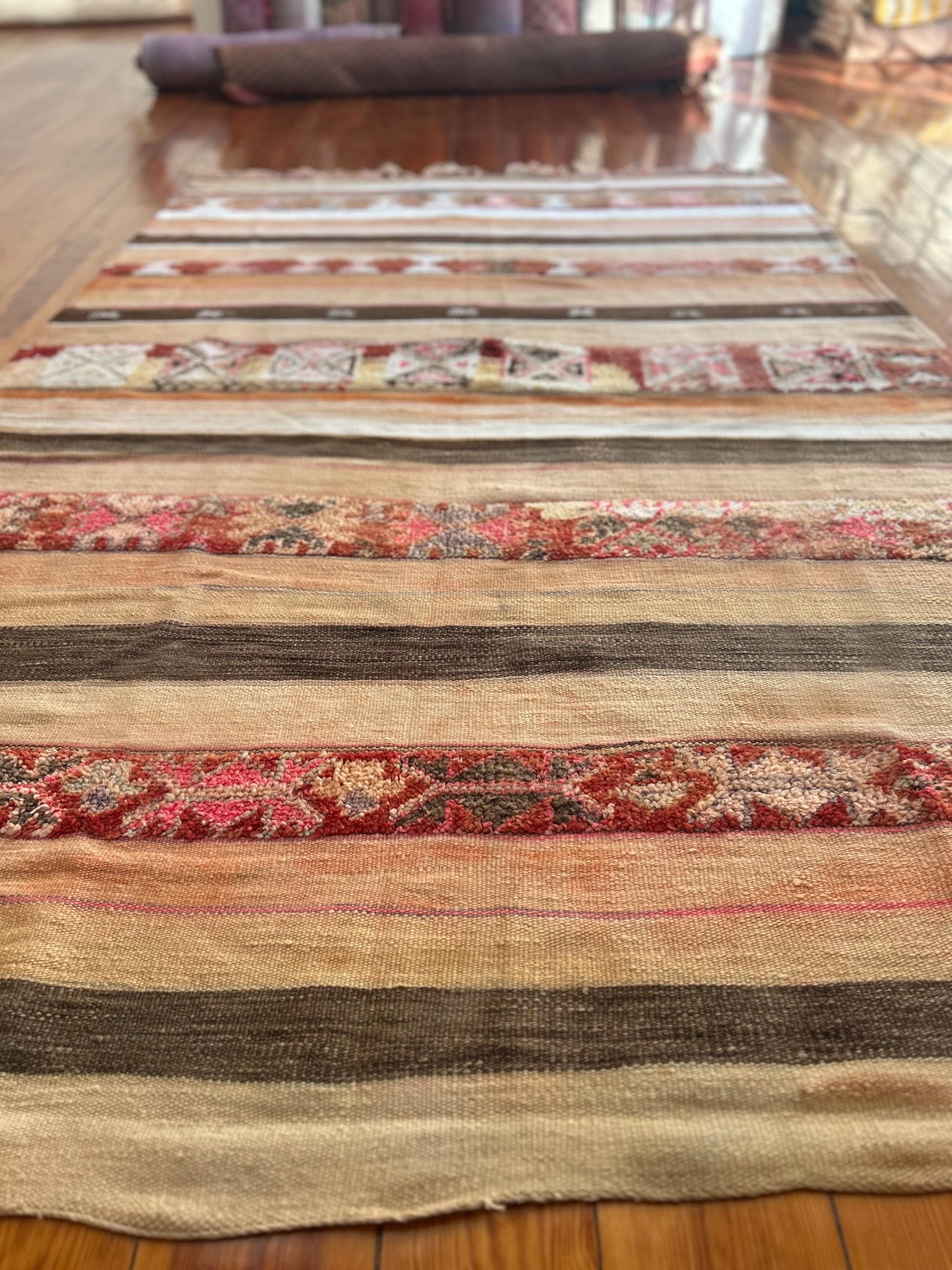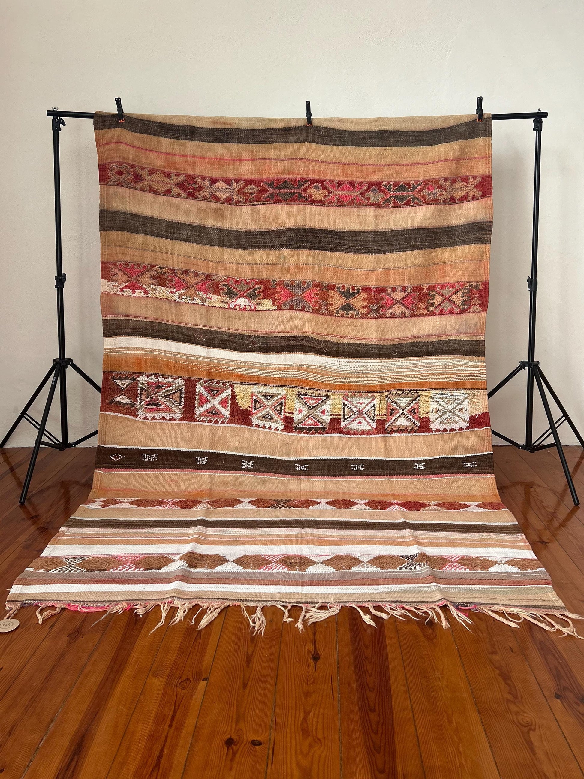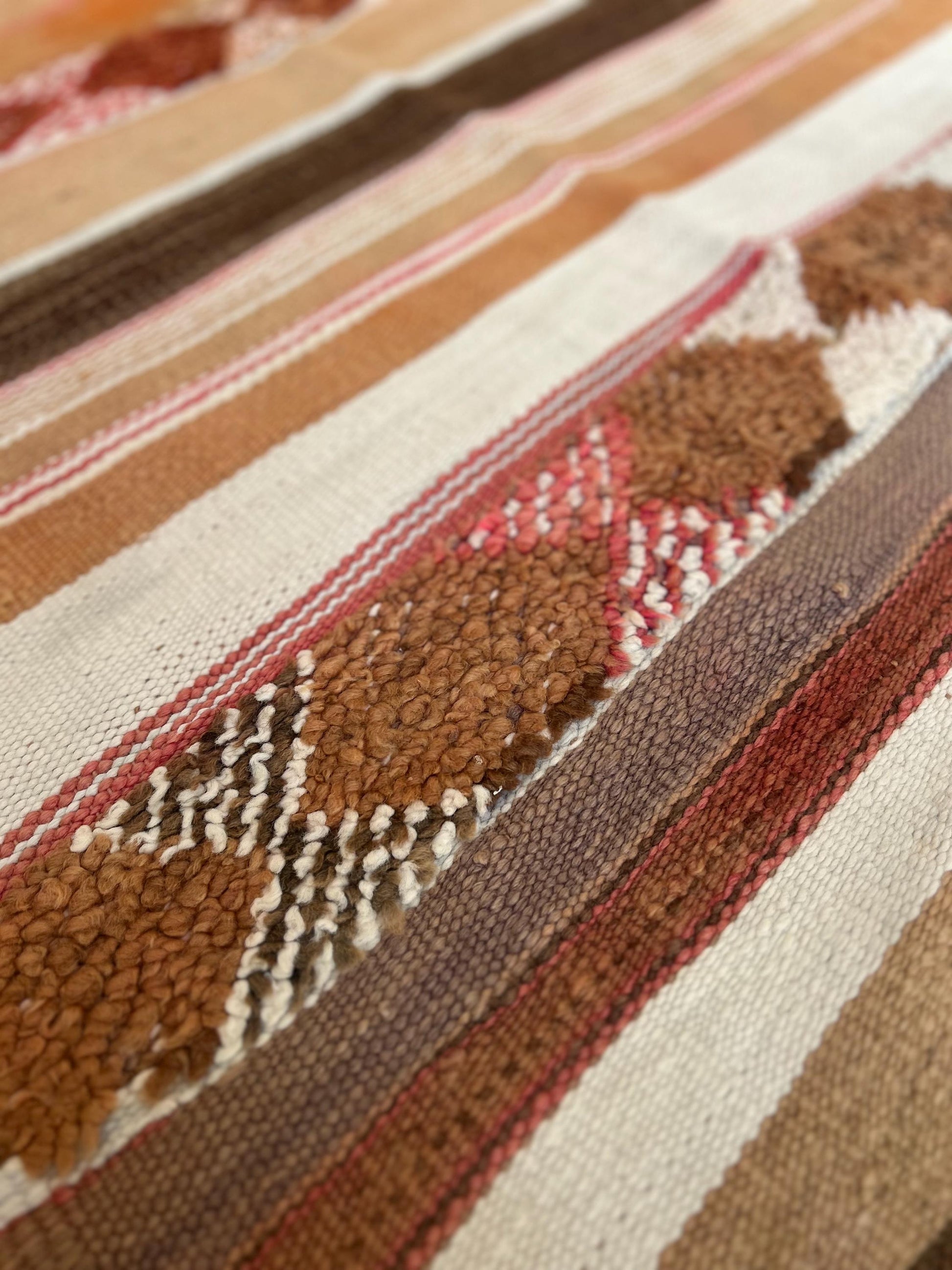 What is a Kilim Rug? Moroccan kilims are highly durable, flat woven rugs, typically made from cotton or wool. Kilim rugs are used by the Berbers for a variety of purposes; as decorative floor or wall coverings in domestic homes or Bedouin tents and even as blankets. Flat weave kilims are referred to locally as “hanbel”. Unlike other types of hand knotted, thick pile Moroccan rugs, kilims are pileless so they are relatively flat and thin. Don’t be deceived by this as Moroccan kilims are incredibly durable and resilient – even for modern day use. Each one is woven by hand on a loom, a lengthy process, which results in an excellent and dense quality rug made to endure everyday life and last for many decades.