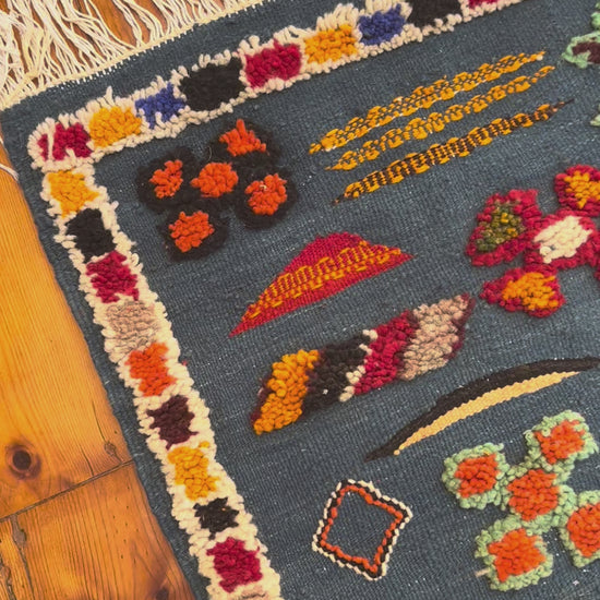 The rugs from the Taznakht area are precious treasures made of Siroua sheep wool, usually flat woven without pile (like hanbel or kilim) or with very short pile, often colored with natural dyes. Soft and resistant, they are all handmade by local artisans and cooperatives. In our collection you will find a selection of Zanafi, Akhnif, Glaoui and Kharita rugs, each with its own particularities.